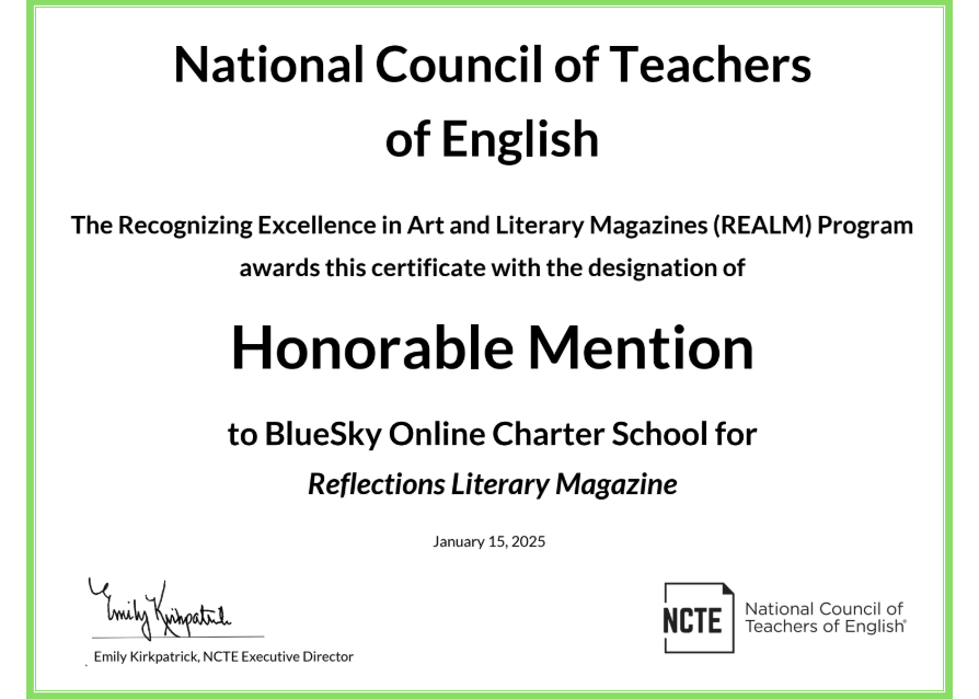 BlueSky’s student literary magazine, SkyWriting: Reflections, earned an Honorable Mention from the National Council of Teachers of English (NCTE). This recognition highlights our students’ creativity, voice, and passion for writing.